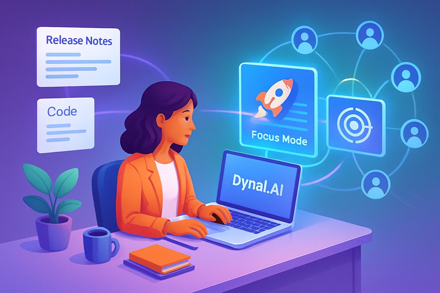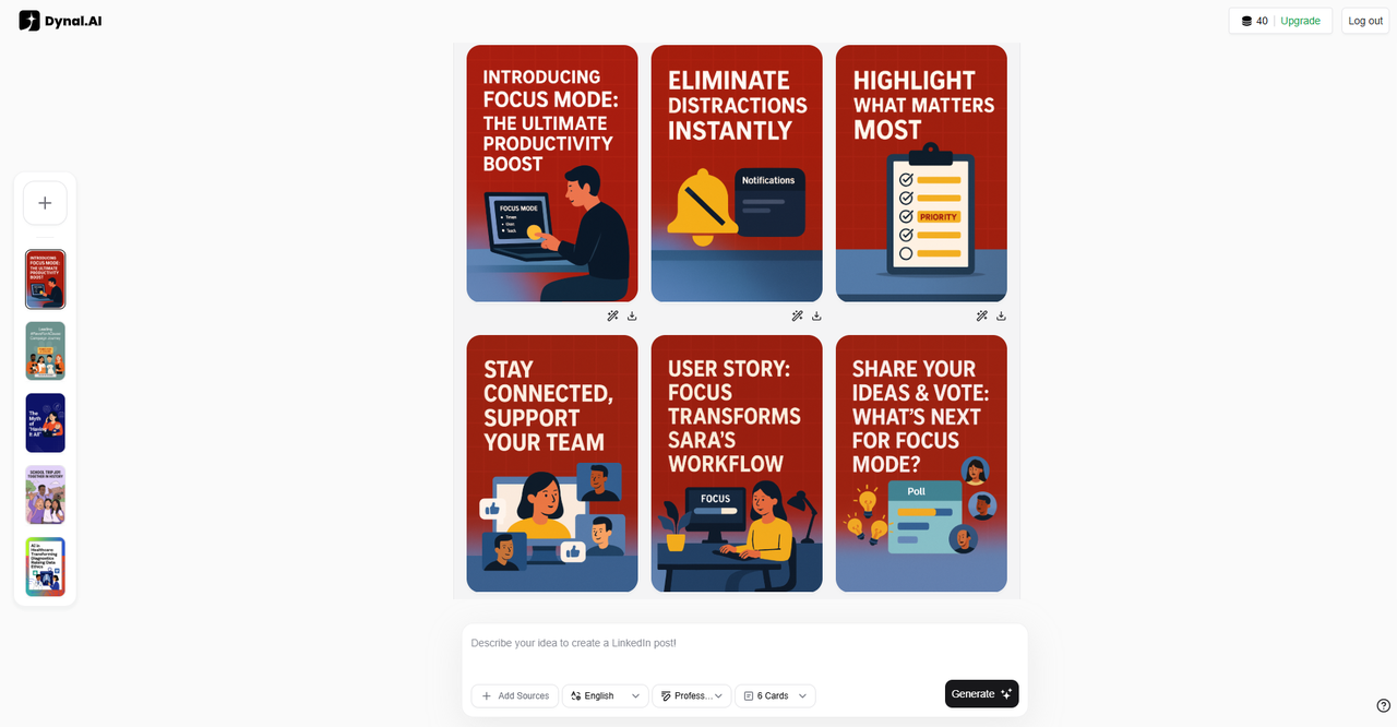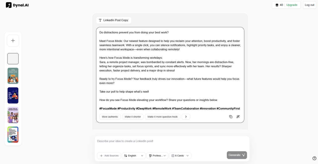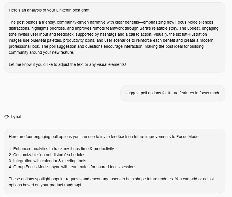 Dynal.AI creates simple infographic visuals and drafts a call-to-action inviting users to try “Focus Mode” and share feedback.