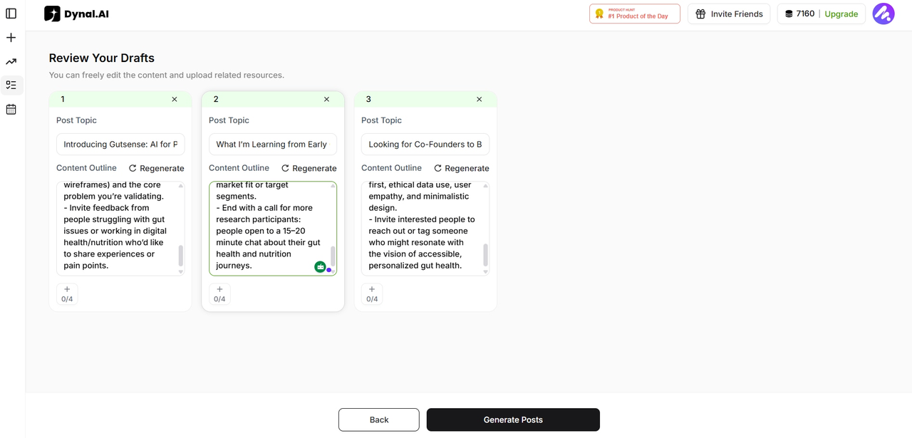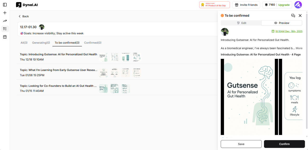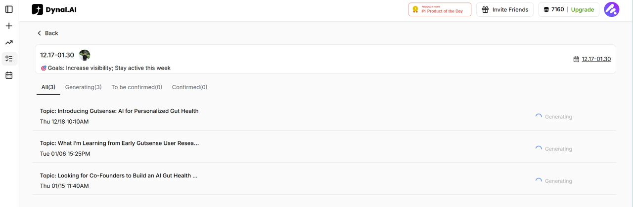 Dynal.AI transforms these ideas into a planned sequence of posts, spreading them intelligently across the week based on the number of posts you selected.