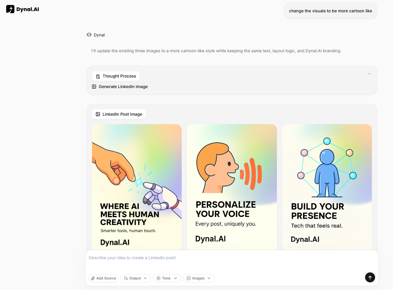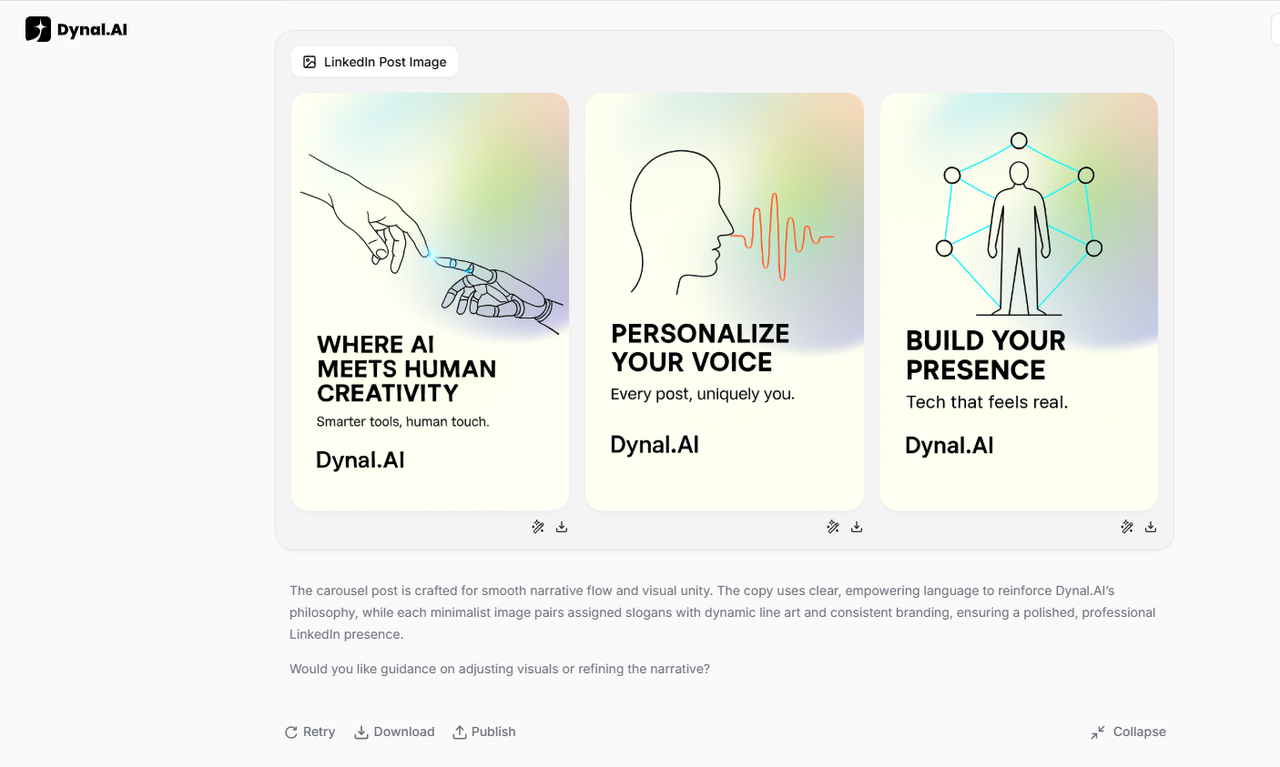 Consider this use case: A management consultant uploads a detailed client case study. Dynal.AI instantly extracts the key challenge, solution approach, and measurable outcomes, then transforms this information into a compelling narrative that showcases expertise without revealing confidential details. The resulting post is professional, insightful, and primed for engagement—all without spending hours on content creation. The platform simultaneously generates a complementary visual that highlights key statistics or takeaways, creating a complete LinkedIn post package.
