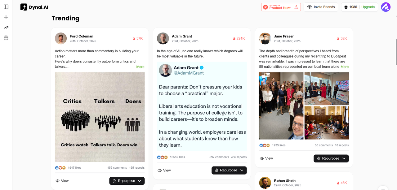 Every recommendation comes with transparent explanation, turning Dynal.AI into both a productivity tool and a LinkedIn strategy coach. Users develop stronger content instincts through regular interaction with the platform's guidance.