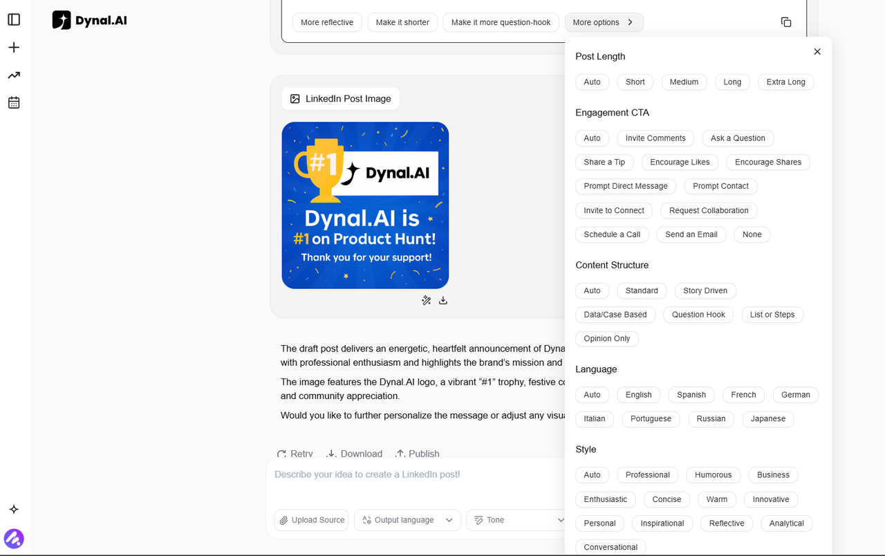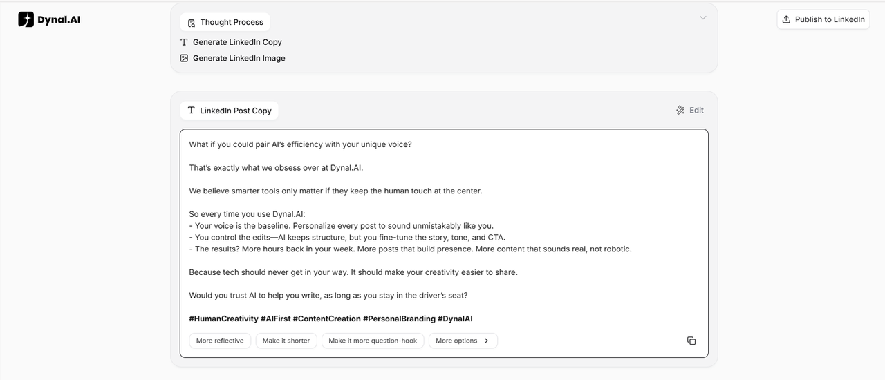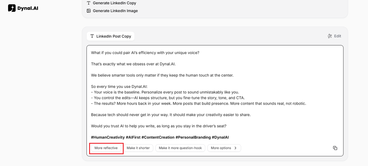 Refining your content should be fast, effortless, and insight‑driven — not a chore. With Dynal.AI, you can instantly explore different versions of your post by selecting from intelligent style and tone options such as More Reflective, More Conversational, More Professional, or More Inspirational.
