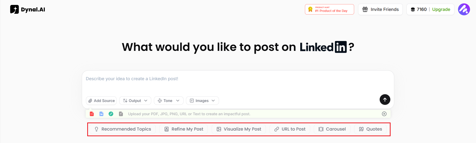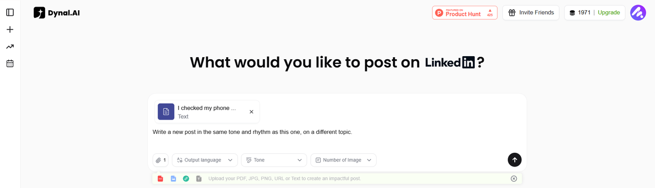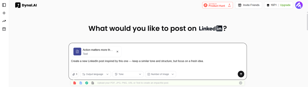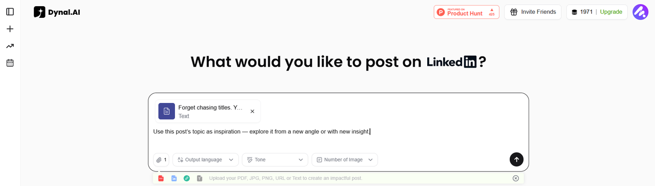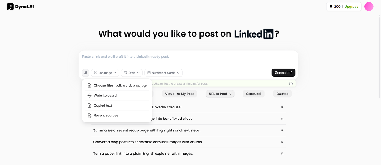 Dynal.AI transforms virtually any source material into LinkedIn-ready content. Simply upload links to articles, research papers, PDF reports, images, or plain text, and watch as the AI extracts key insights, supporting data, and compelling narratives.