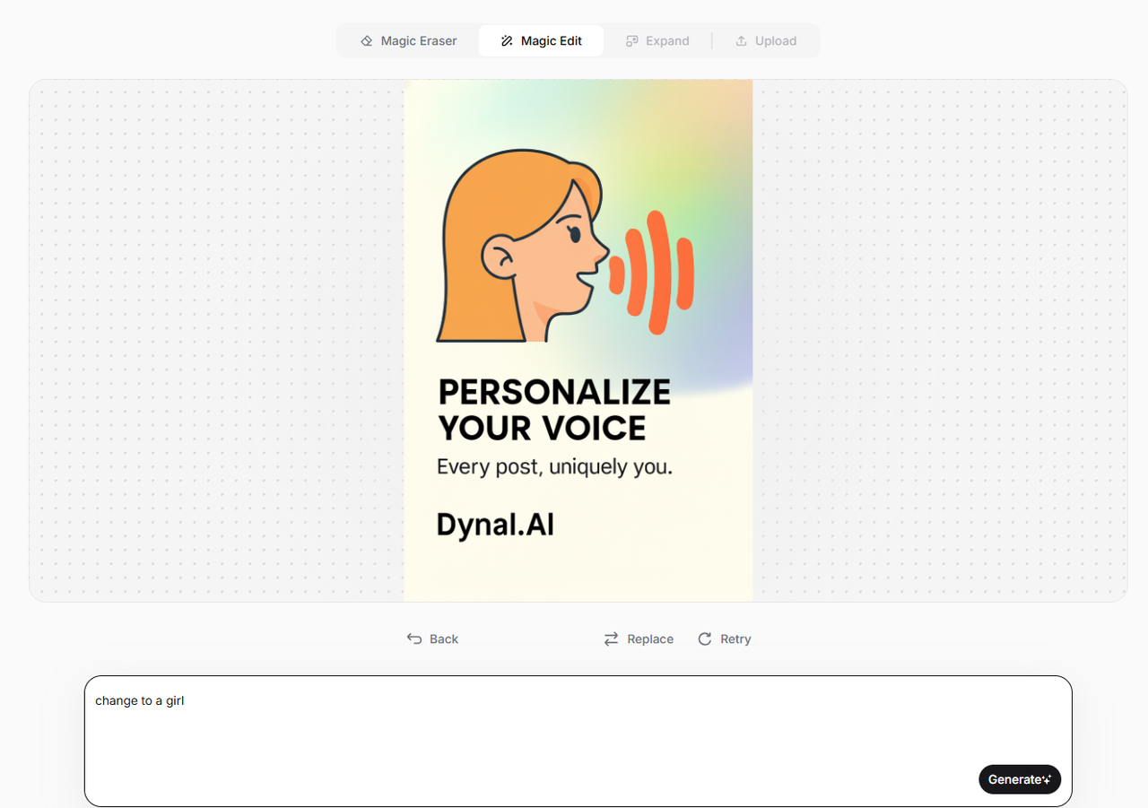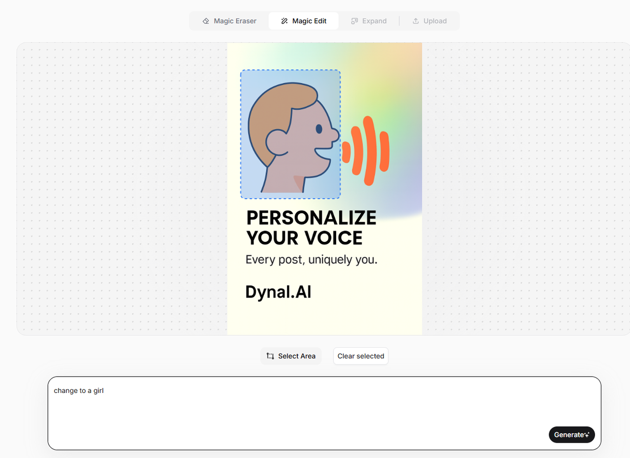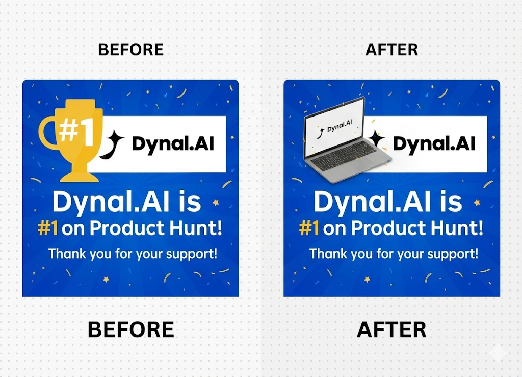 For visuals, Dynal.AI uses a Magic Edit feature that lets you describe the exact change you want to make — such as “update the heading text to say ‘Milestone unlocked’” or “replace the trophy with a laptop illustration.”