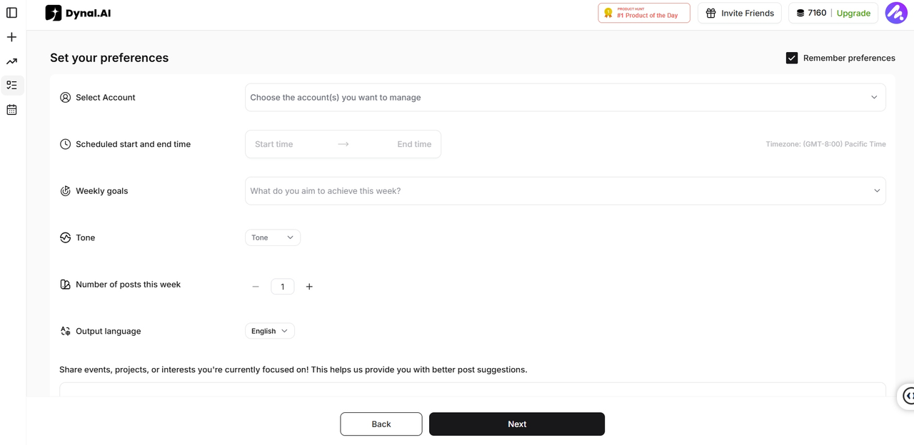 Start by telling Dynal.AI what you want to achieve this week (for example, increase visibility or stay active) and how many posts you want to publish. You can also set your time window, tone, and output language so every post aligns with your current priorities. Next, drop in your post ideas—topics you want to talk about, launches, learnings, or prompts you have in mind.