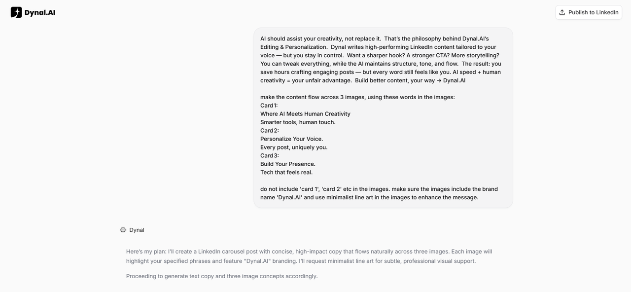 Publishing your content to LinkedIn should feel effortless — and with Dynal.AI, it is.Share your completed posts directly to your personal or company LinkedIn page in just one click, or schedule your preferred release time. No complicated setup or manual upload process — just smooth, simple publishing designed for anyone who wants to stay consistent without the hassle.
