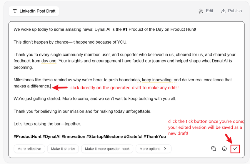 Dynal.AI’s modular design allows you to edit specific parts of your post independently. Want to refine your opening hook, rephrase a key point, or soften a strong CTA? Simply select the section and update it without losing your overall flow.