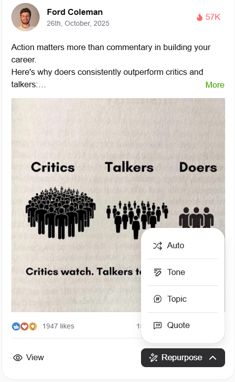 Auto' allows you to create a new LinkedIn post inspired by your chosen post, keeping a similar tone and structure but focusing on a fresh idea.