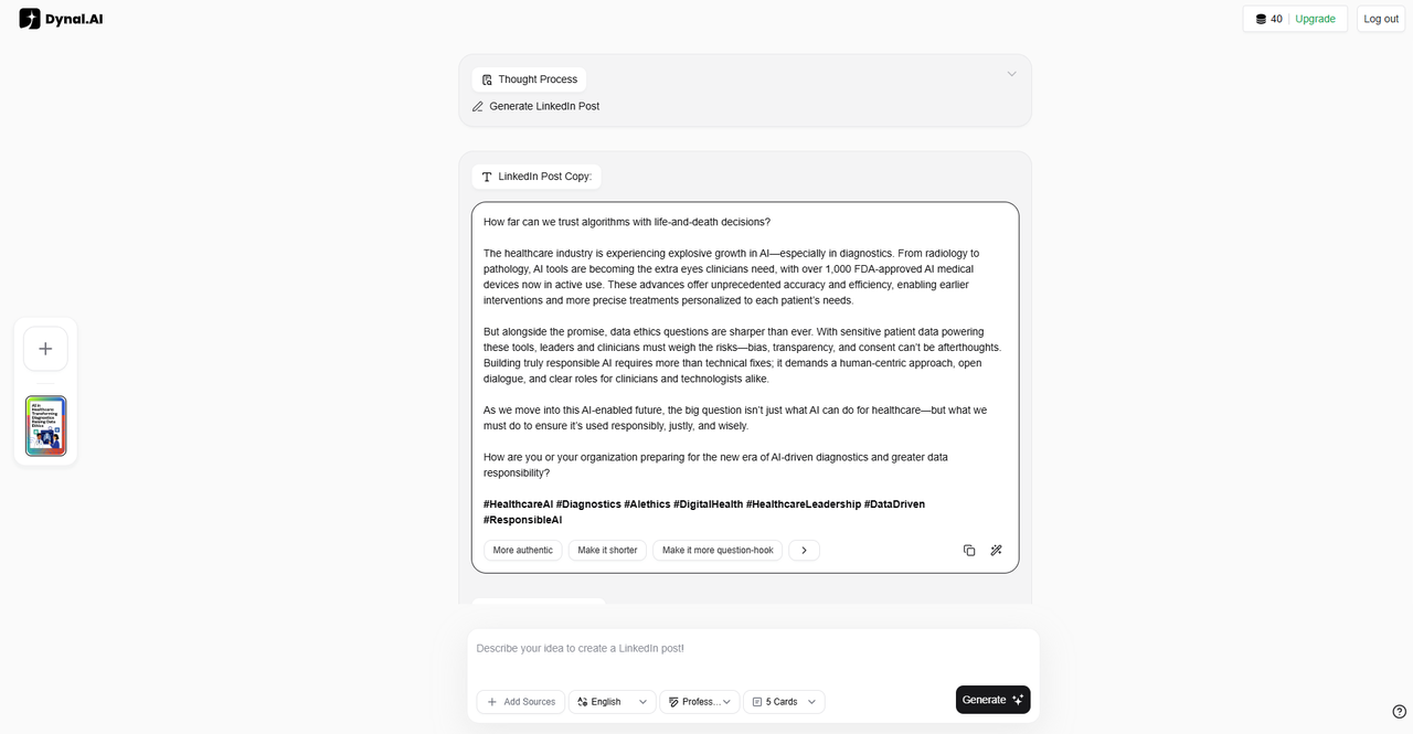 Dynal.AI distills the technical content into a LinkedIn post draft, capturing Priya’s clear, thoughtful tone and always ending with a question to spark discussion.