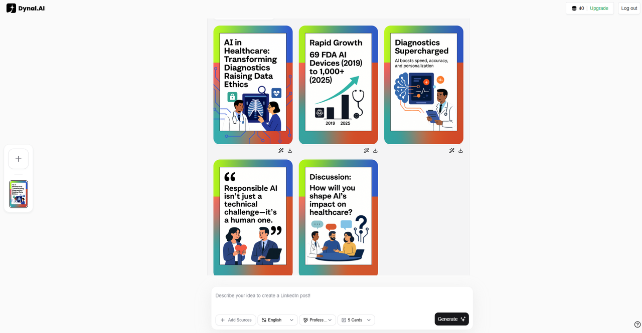 Dynal.AI also suggests a poll question: “How are you or your organization preparing for the new era of AI-driven diagnostics and greater data responsibility?”—helping Priya involve her audience in the topic. This step is essential in encouraging comments on her post, driving engagement rates upwards.