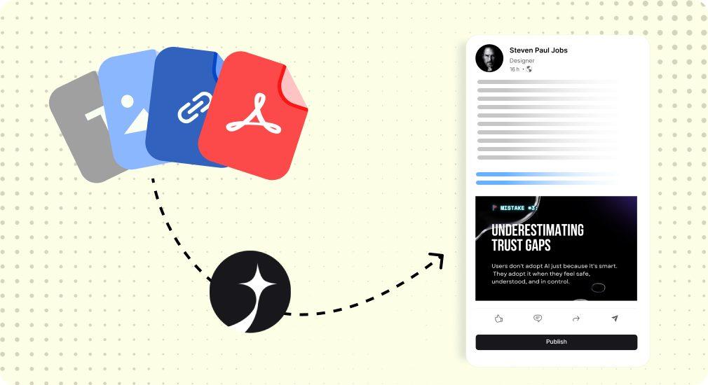 Convert websites, PDFs, documents, images, YouTube videos, or even content from other social media platforms into a well crafted LinkedIn post.